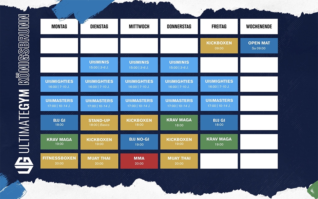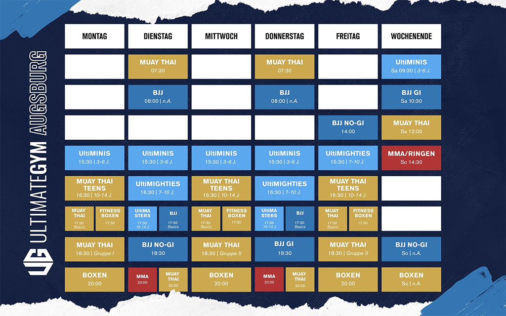 Das Ultimate Gym Augsburg ist eine der ältesten und führenden Kampfsportschulen der Region. Unser umfangreiches Kursangebot umfasst BJJ, Muay Thai, Boxen, MMA und Fitness – für alle Altersgruppen und jedes Trainingsniveau.